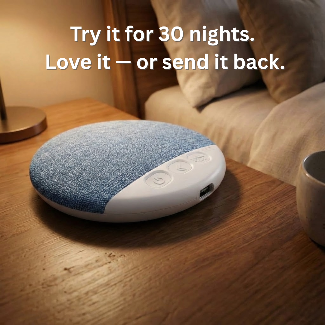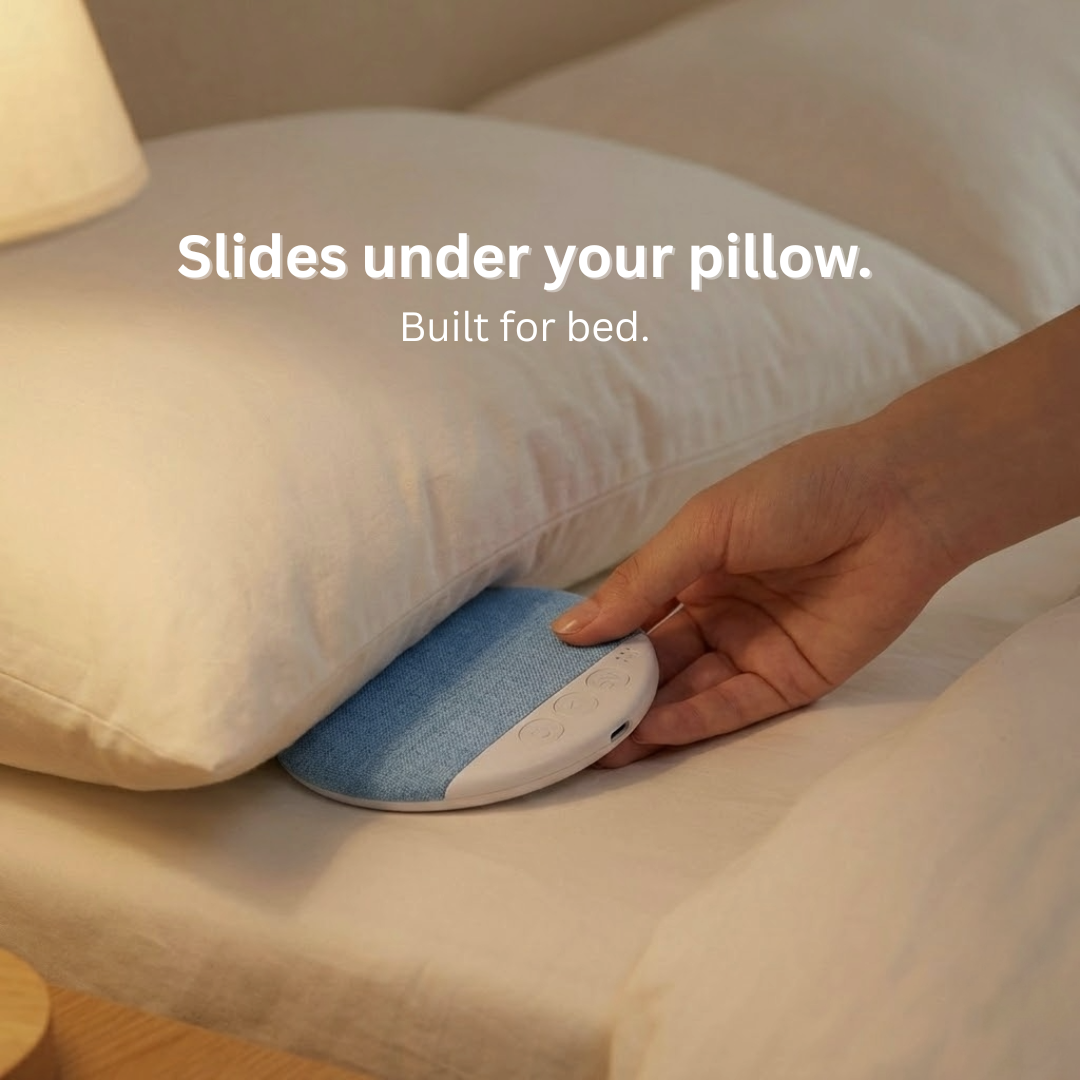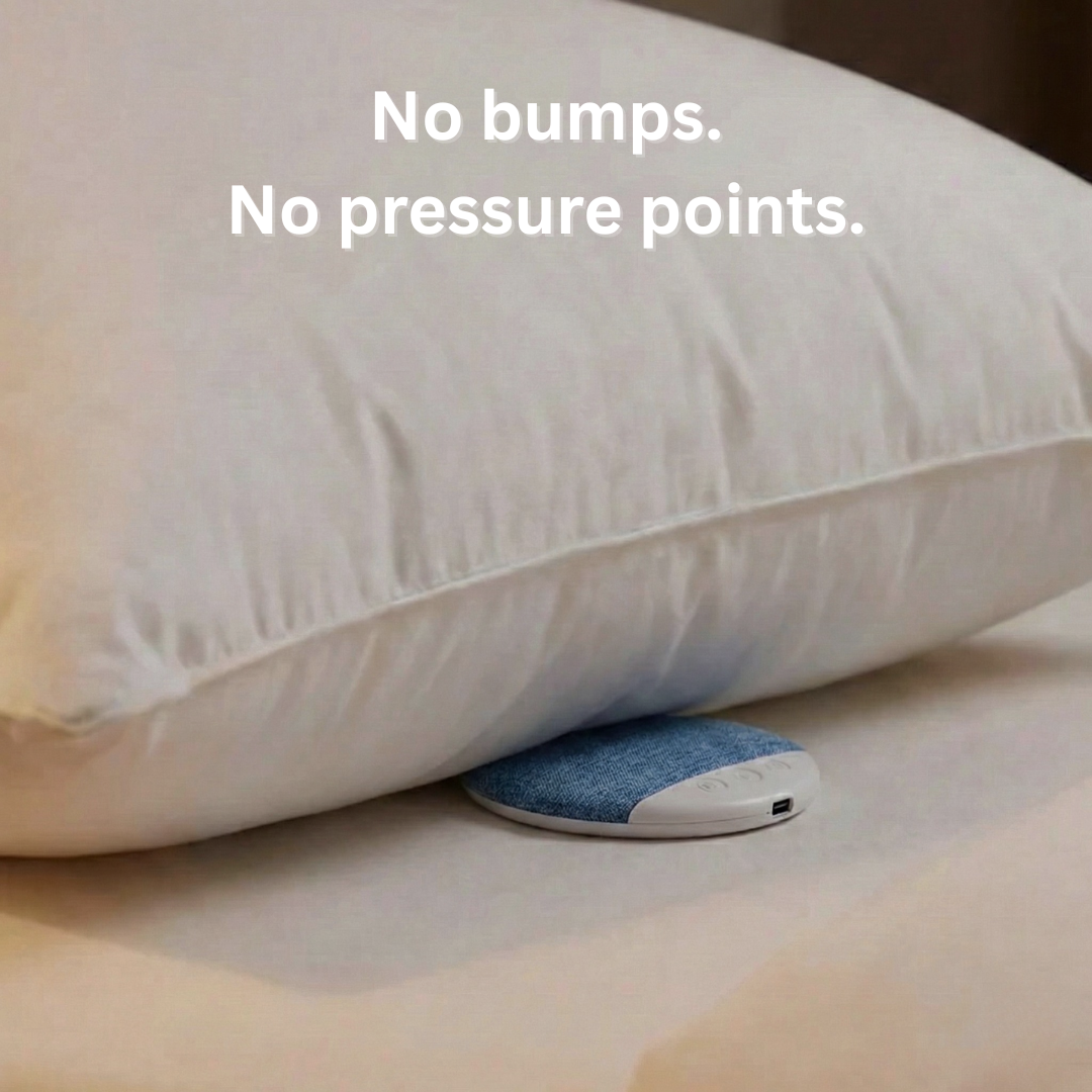 QuietNest™ slides under your pillow and connects via Bluetooth — no straps, no wires, nothing in your ears.